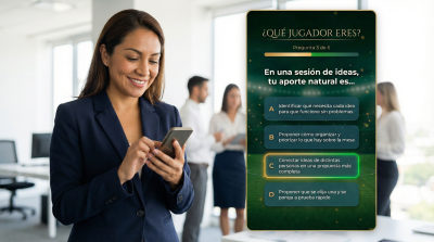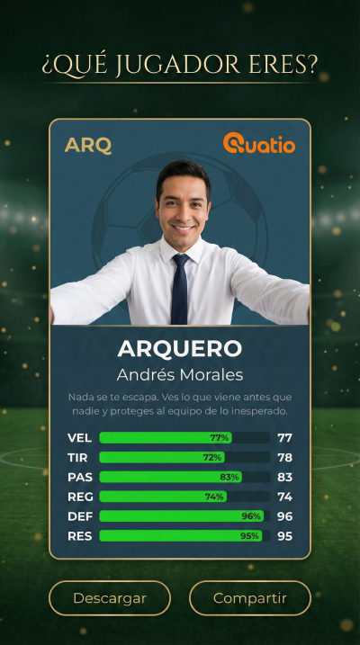Descubre tu laminilla en el Dream Team. Cada participante responde un quiz de 6 preguntas sobre su estilo de trabajo, se toma una selfie y recibe una laminilla coleccionable estilo FIFA Ultimate Team con su foto, posición en la cancha (Arquero, Defensa, Mediocampista o Delantero), descripción de su arquetipo y 6 estadísticas únicas calculadas según sus respuestas. La selfie se procesa automáticamente con extracción de fondo para crear un cutout profesional. El resultado es una carta personalizada que se puede descargar y compartir en redes sociales. Incluye un muro "Nuestro Equipo" que muestra todas las laminillas generadas, creando un sentido de pertenencia y equipo. Ideal para endomarketing, team building, activaciones de marca en temporada mundialista y eventos corporativos donde se quiere conocer al equipo de una forma divertida y memorable.