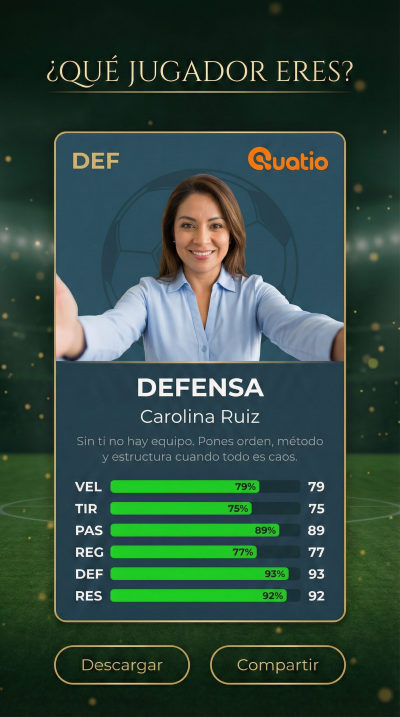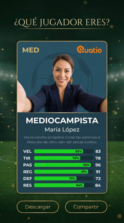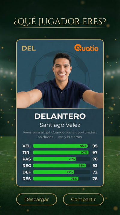 Quiz de personalidad con temática de fútbol que genera una laminilla coleccionable estilo FIFA con la foto, posición y estadísticas únicas de cada participante.