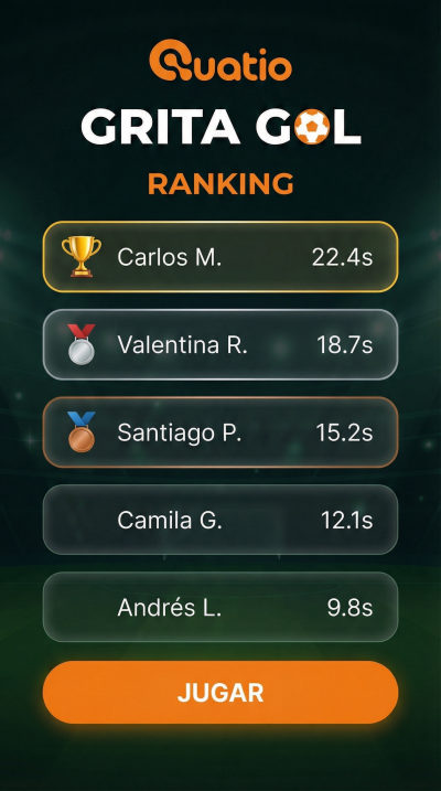 Experiencia web donde los participantes gritan GOOOL y sostienen el grito el mayor tiempo posible, como un narrador de fútbol profesional. Las letras GOOOL en pantalla funcionan como medidor de intensidad: se llenan de color proporcionalmente al volumen del grito. Cuando la intensidad supera el umbral de activación, el cronómetro arranca y cuenta sin límite. Si el volumen baja, se corta y se registra el tiempo. El puntaje combina duración, volumen promedio y pico máximo de intensidad, premiando tanto la resistencia como la potencia. Incluye módulos opcionales de registro de participantes (directo o por QR), ranking en tiempo real y diseño completamente personalizable con la identidad de la marca. Ideal para activaciones deportivas, temporada mundialista, ferias y cualquier evento donde se quiera generar filas, competencia y máxima energía.