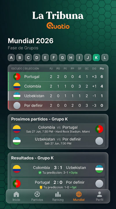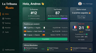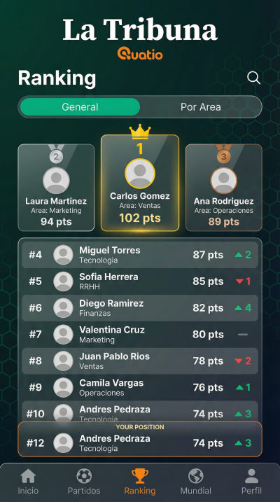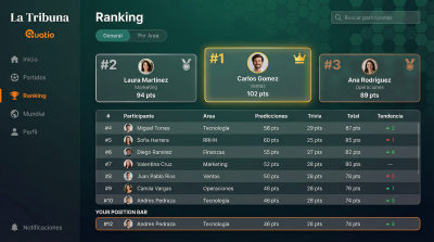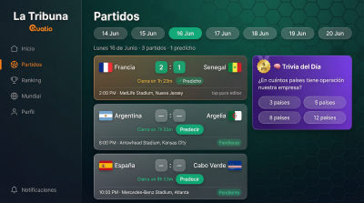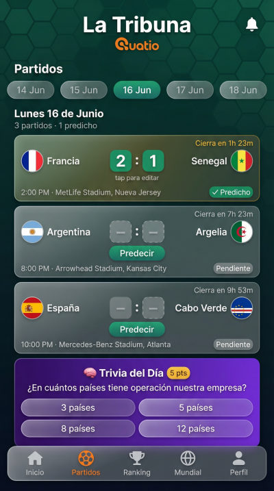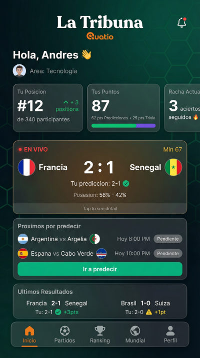 ContactarLa Tribuna es una plataforma de engagement corporativo con temática deportiva. Los participantes predicen resultados de partidos del Mundial y responden preguntas de trivia corporativa para sumar puntos en un ranking general. Cada predicción cierra automáticamente al pitazo inicial de cada partido, con datos deportivos 100% en tiempo real. La trivia refuerza cultura organizacional, valores o conocimiento de producto — el verdadero objetivo de la empresa detrás de la diversión. Incluye dashboard personal con estadísticas, leaderboard con filtro por área o sede, tabla de grupos del Mundial actualizada en vivo y modo TV/Videowall para pantallas grandes en oficinas. Todo personalizable con la marca del cliente. 5-6 semanas de engagement sostenido que convierten la fiebre mundialista en conexión con tu empresa.